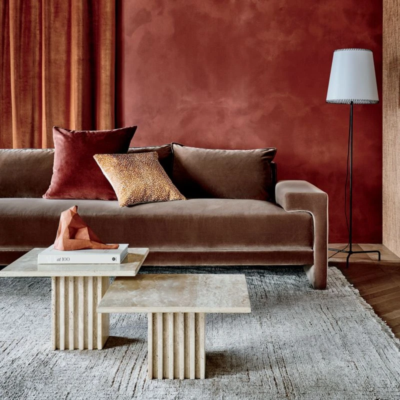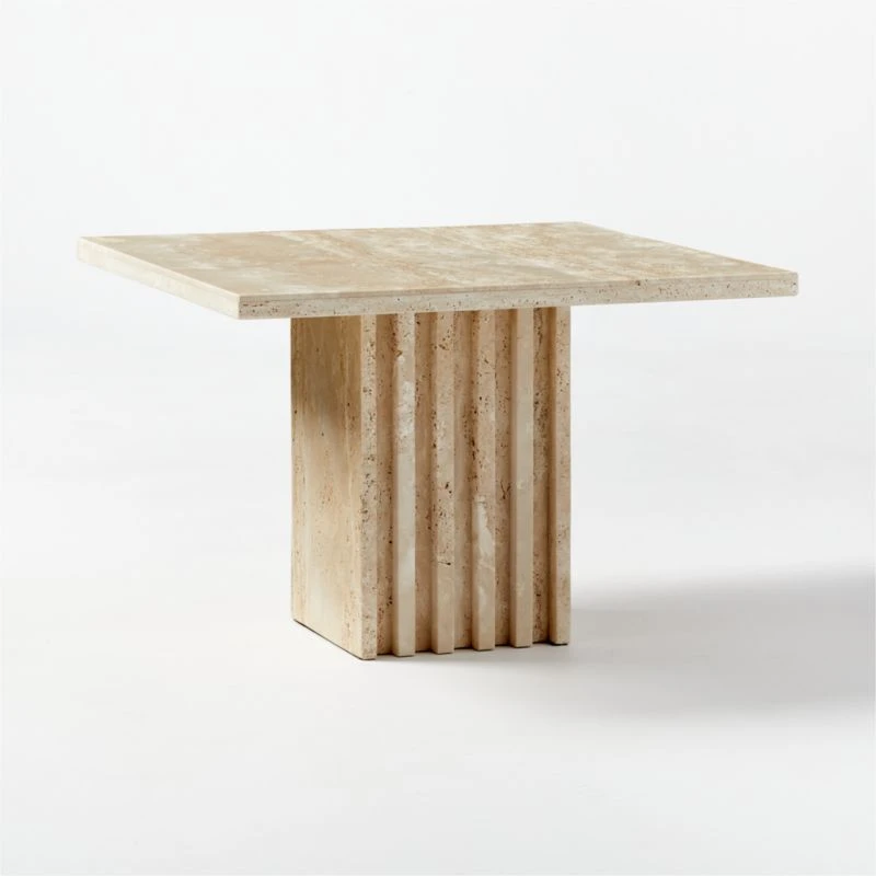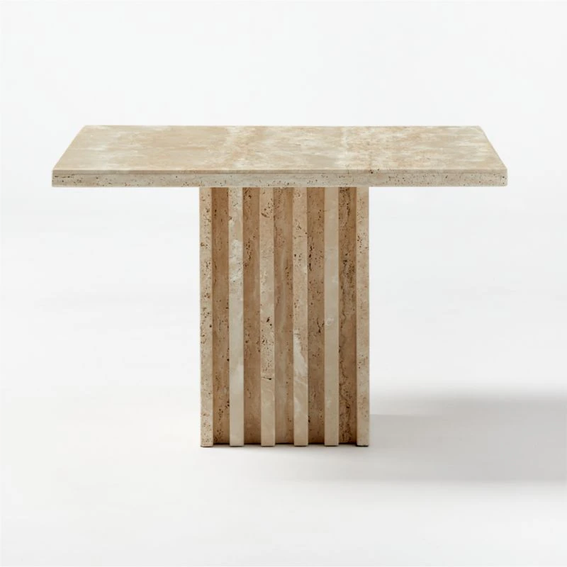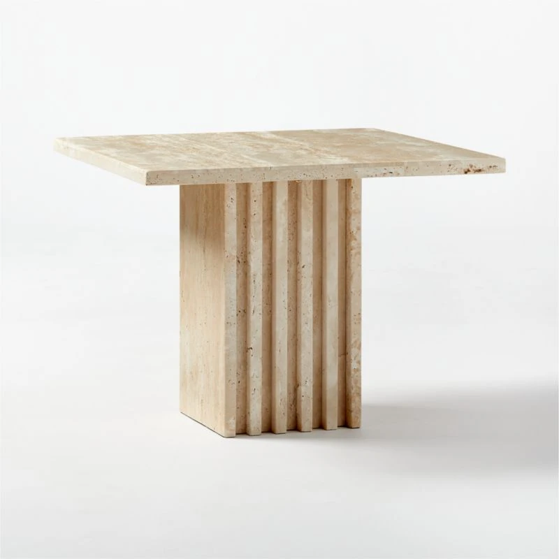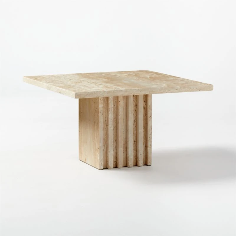 Cocktail table is made of pure, unpolished travertine and inspired by 1970s Italian modern designs, featuring an architectural silhouette, layered ivory tones and a style we’re calling “soft brutalism.” Fluted details on the base and variation in the natural travertine add to the coveted vintage feel. Learn about Studio Anansi on our blog. CB2 exclusive.