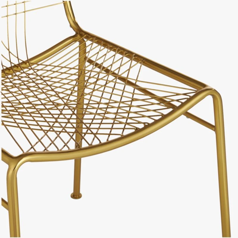 Dare to dine up a notch. Modern metallic lacquers handmade iron frame with woven wire back expertly welded into a graphic linear pattern. Coated in brilliant brass, chair glamorously juxtaposes our wooden dining tables or adds shine to the home office. alpha brass chair is a CB2 exclusive.