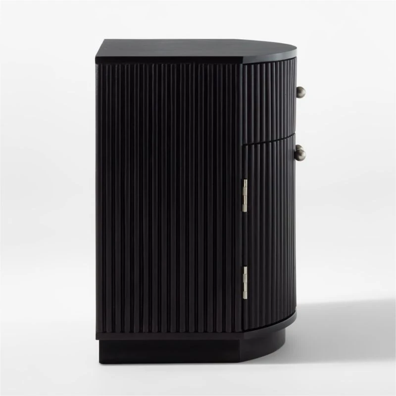 Black-stained mango wood nightstand supports a unique, curved silhouette and configuration: one drawer and two doors concealing a shelf inside for extra storage. We love the on-trend channeled detailing and satin-finish stainless steel knobs, too. CB2 exclusive.
