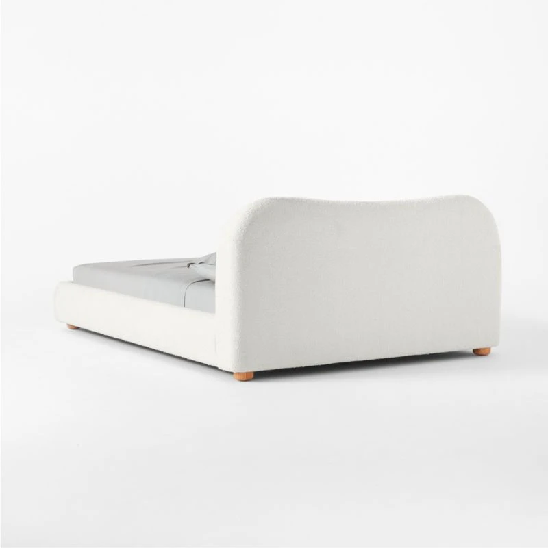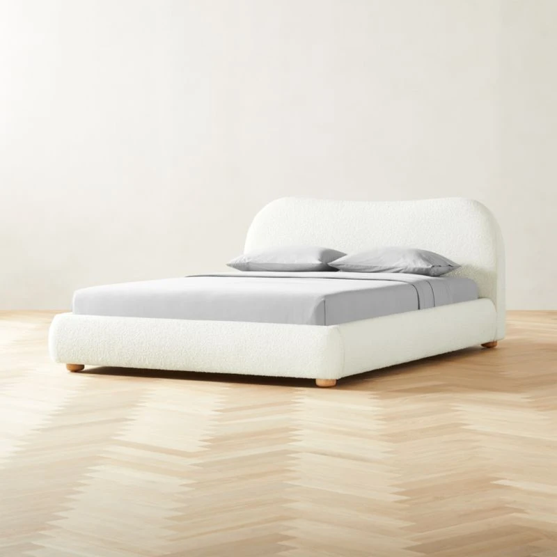 Say it with us: all-over boucle. White king bed designed by Ross Cassidy is reminiscent of 1930s Italy with its shapely curves and cloud-like presence. A subtle nod to traditional camel-back silhouettes, with a dose of Ross’s signature flair. CB2 exclusive.