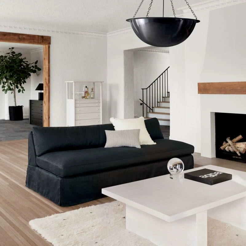 Clean ivory linen/cotton blend pillow lays an inviting neutral base for any lounging situation. “The fabric is very casual,” says designer Kara Mann. “It has this very soft tactile feel.”