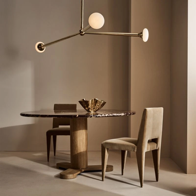 Designed by Brett Beldock, round oak base supports a solid slab of unique red Levanto Marble with flecks of tonal brown veining. CB2 exclusive.