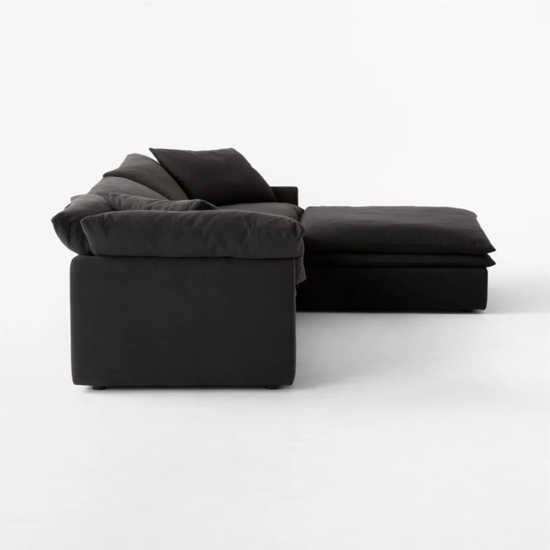 Low, oversized linen sectional sofa is casually chic while maximizing comfort.. Double-stacked pillowy seat and loose cushions throughout are upholstered in a charcoal black easy-care performance linen blend, creating an unbelievably soft place you’ll never want to leave. Combine it with other Mattea pieces to create a sectional to fit your space. CB2 exclusive.