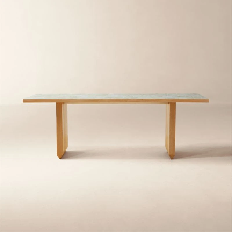 Crushed agate dining table highlights a striking mix of organic materials. Wirebrushed oak lends a textural richness to the understated silhouette, while the crushed agate top is full of rich tonal grey and white activity for a dramatic look. CB2 exclusive.