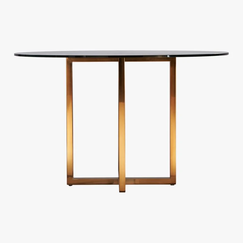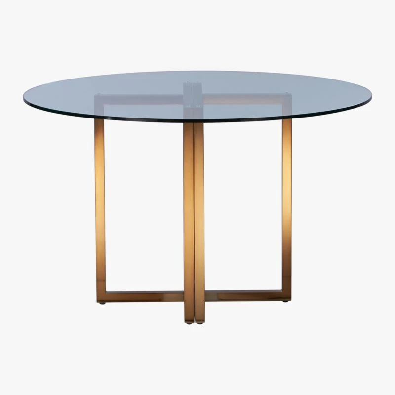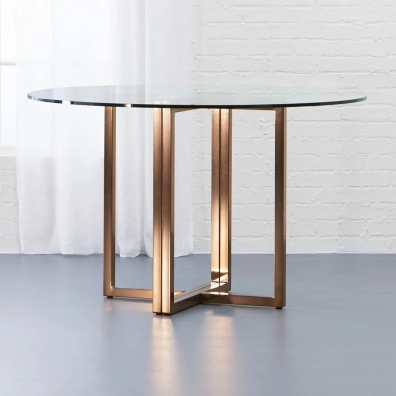 A gilded update to our popular chrome version. Two sleek brass “sawhorses” partner with crisp, clear glass tops, round or rectangle—your choice. For more leg room and stability, we suggest the brass-plated iron structures meet in the middle (shown).