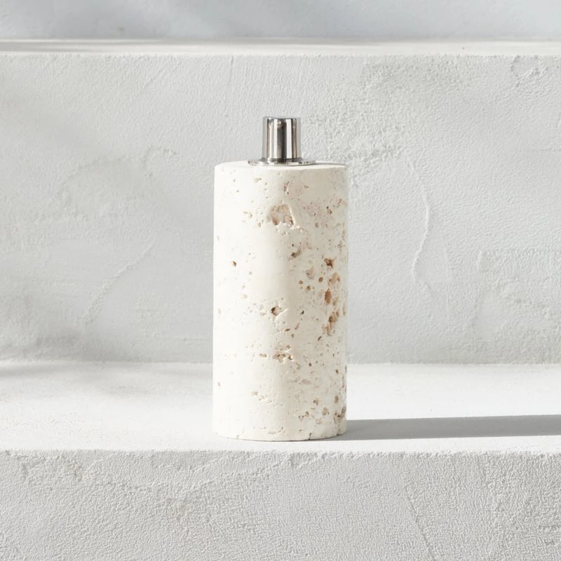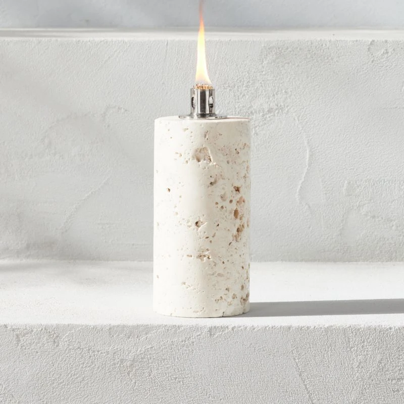 Renowned designer Ross Cassidy updates the classic oil lamp through a naturally luxurious materiality. Crafted from honed white travertine, each small oil lamp highlights the organic texture and tonal variations of the stone, ensuring that no two pieces are alike. CB2 exclusive.