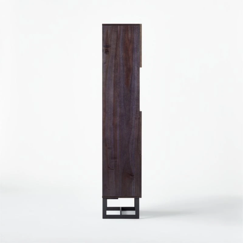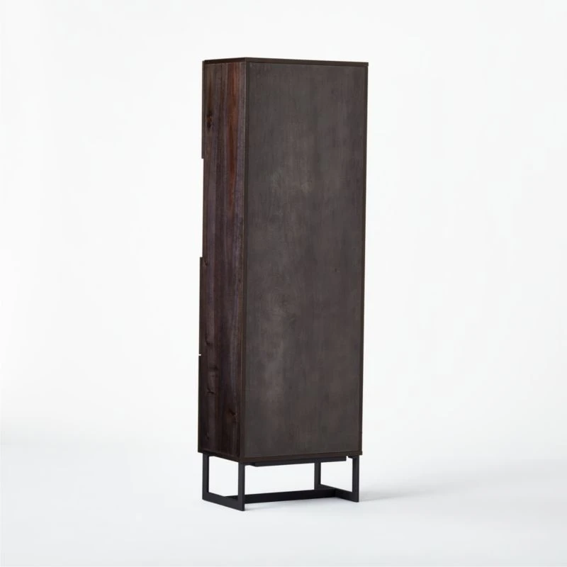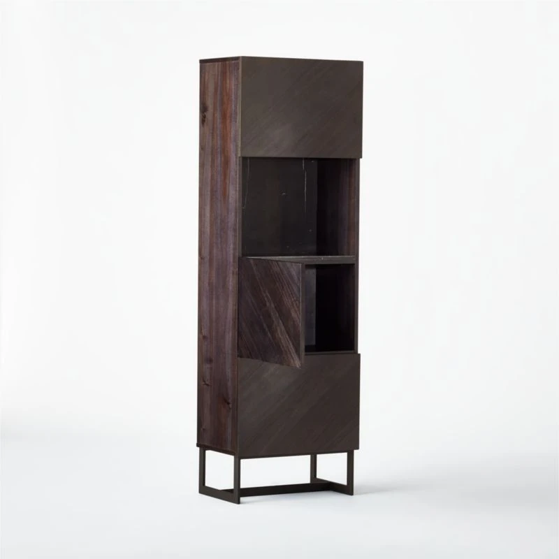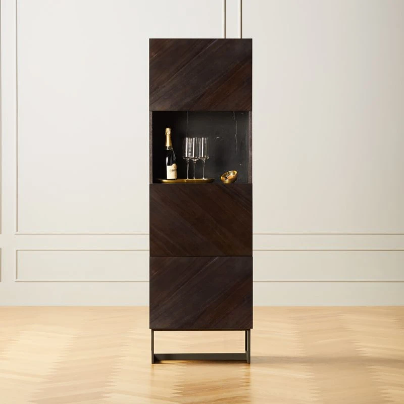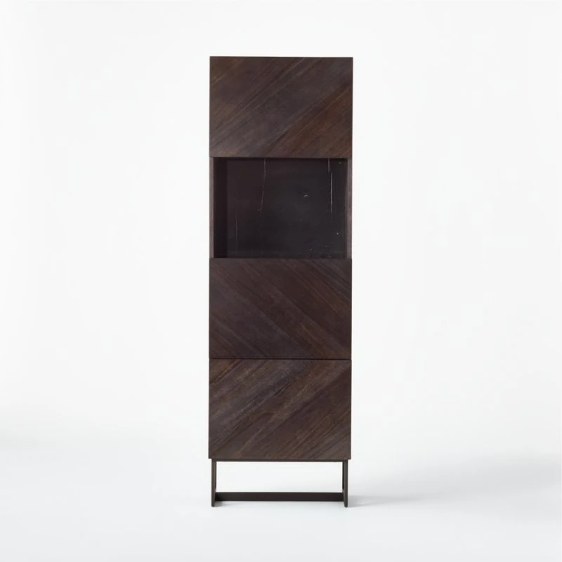Designed by VUUE, charcoal walnut veneer frame stands tall with three cabinet doors that open to concealed storage. Precisely cut panels angle diagonally across each door to create an abstract chevron pattern of swirling grains and tones. Single open storage space, defined by slabs of black marquina marble on the shelf and in back, sits cabinet-height. Wood and marble cabinet chicly hides guilty-pleasure reads or serves strong drinks in the living room. Learn more about VUUE on our blog. CB2 exclusive.