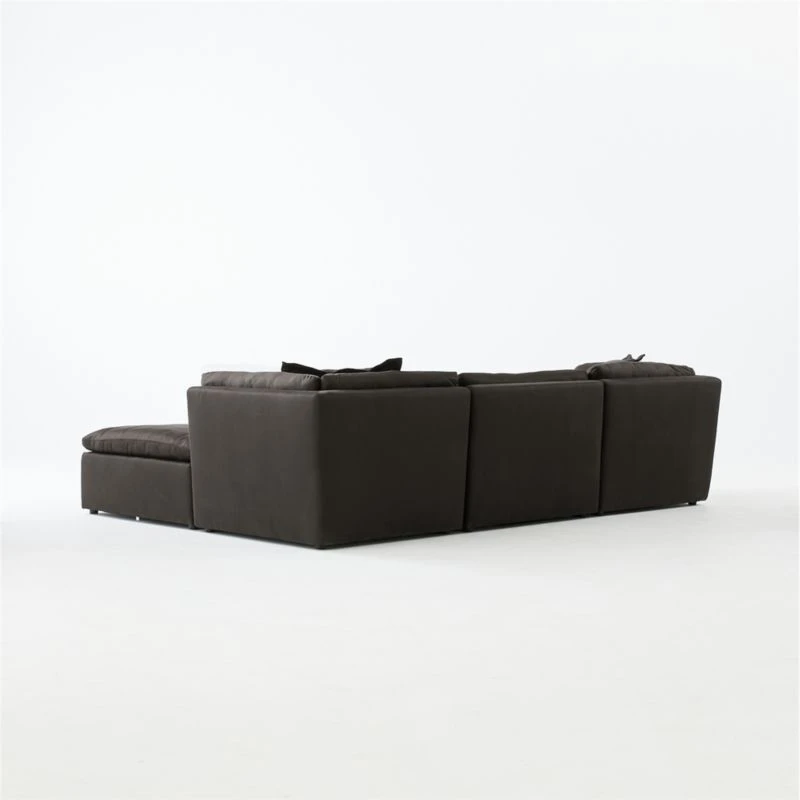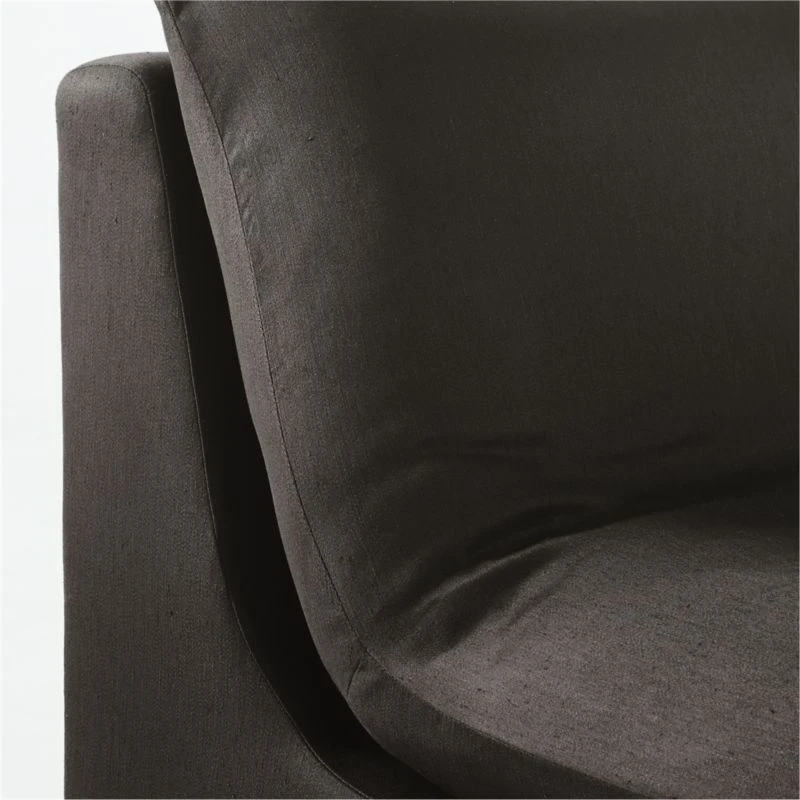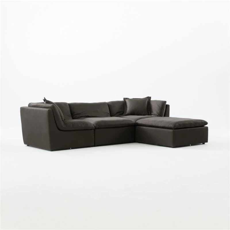 “I’m loving this sectional,” says designer Kara Mann. “It’s got this pillowed, effortless feel about it.” Thanks to plush feather down cushions covered in luxe black sateen with a slub texture that keeps it from feeling too fussy. Subtle curves make this sectional perfect for lounging. Arrange and rearrange the two corner chairs, one armless chair and ottoman to fit your changing needs. CB2 exclusive.